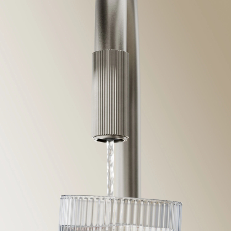 Kuchyňská baterie OMNIRES SWITCH kombinuje minimalistický design založený na vyvážených proporcích s praktickou funkčností, poskytuje běžnou a filtrovanou vodu. Výrazné, precizně žebrované detaily umožňují intuitivní použití tím, že označují dva nezávislé body otevření vody: běžnou vodu u mixéru a filtrovanou vodu na konci výtoku – stačí na ní otočit kroužkem a sklenici naplnit rychlým proudem pitné vody.