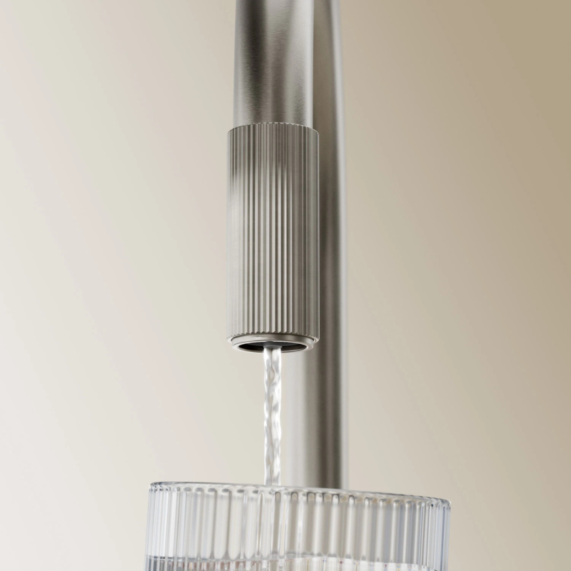 Kuchyňská baterie OMNIRES SWITCH kombinuje minimalistický design založený na vyvážených proporcích s praktickou funkčností, poskytuje běžnou a filtrovanou vodu. Jasné, přesně žebrované detaily umožňují intuitivní použití tím, že označují dva nezávislé body otevření vody: běžnou vodu na mixéru a filtrovanou vodu na konci výtoku - stačí otočit kroužkem umístěným na něm a naplnit sklenici rychlým proudem pitné vody s nejvyšší chutí.