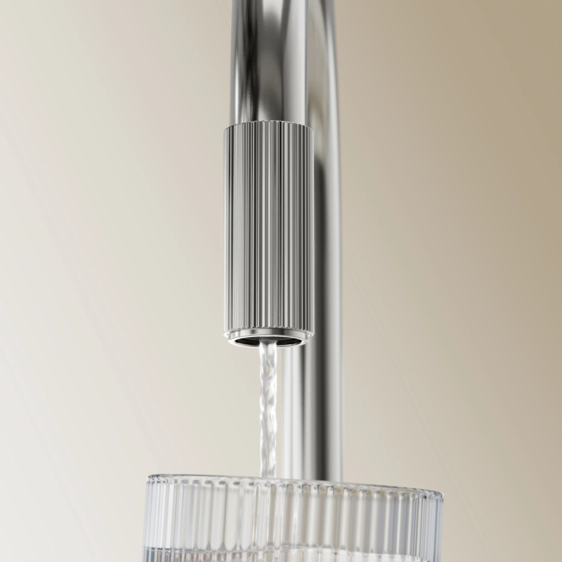 Kuchyňská baterie SWITCH kombinuje minimalistický design, který vychází z vyvážených proporcí, s praktickou funkčností, která poskytuje běžnou i filtrovanou vodu. Jasně definované a precizně zpracované detaily umožňují intuitivní použití směřováním do dvou oddělených proudů vody: běžné vody poblíž páky a filtrované vody na konci výtoku – stačí otočit žebrovaným kroužkem výtoku a rychle si naplníte sklenici lahodně čerstvou pitnou vodou. Otočný vytahovací výtok dále vylepšuje funkčnost kuchyňské baterie a nabízí delší dosah a volnost pohybu kolem dřezu. Zjednodušuje oplachování, mytí a napouštění a zároveň umožňuje důkladné čištění celé pracovní plochy.