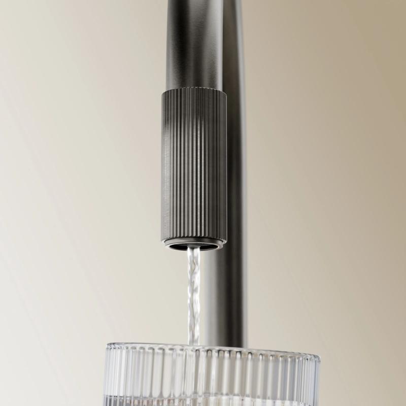 Kuchyňská baterie SWITCH kombinuje minimalistický design, který vychází z vyvážených proporcí, s praktickou funkčností, která poskytuje běžnou i filtrovanou vodu. Jasně definované a precizně zpracované detaily umožňují intuitivní použití směřováním do dvou oddělených proudů vody: běžné vody poblíž páky a filtrované vody na konci výtoku – stačí otočit žebrovaným kroužkem výtoku a rychle si naplníte sklenici lahodně čerstvou pitnou vodou. Otočný vytahovací výtok dále vylepšuje funkčnost kuchyňské baterie a nabízí delší dosah a volnost pohybu kolem dřezu. Zjednodušuje oplachování, mytí a napouštění a zároveň umožňuje důkladné čištění celé pracovní plochy.