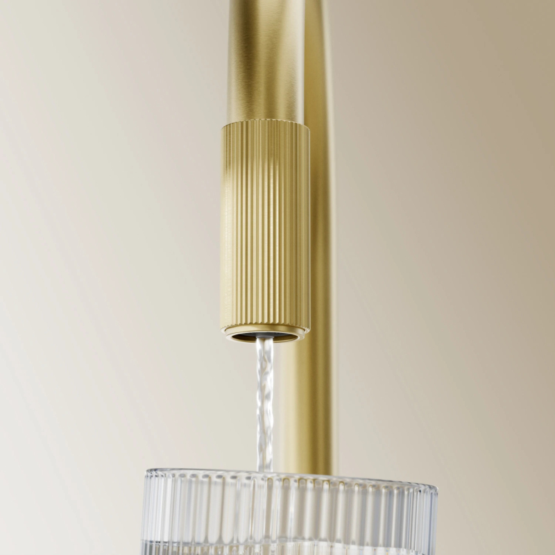 Kartáčovaná mosaz má sofistikovanou povrchovou úpravu s chladným zlatým odstínem a saténově kartáčovaným povrchem. Produkt je potažen pokročilou technologií PVD.