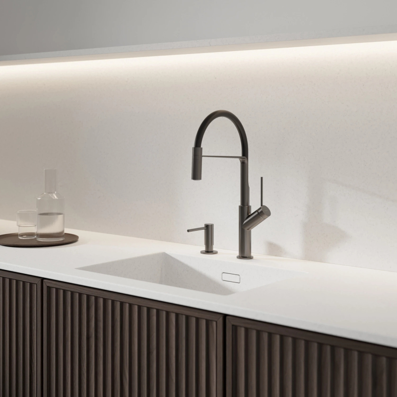 Kuchyňská baterie OMNIRES VITA spojuje moderní minimalistický design s vysokou funkčností, která zpříjemní každodenní práci v kuchyni. Její tvar inspirovaný hladkou geometrií oblouku vytváří lehkou a vizuálně vyváženou siluetu, která dokonale zapadne do současných interiérů.