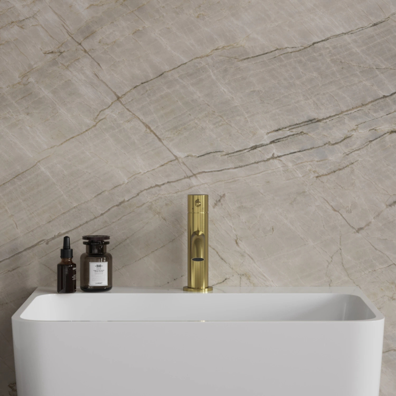 Kartáčovaná mosaz má ušlechtilou povrchovou úpravu v odstínu studeného zlata a saténově broušený povrch. Povlak byl vyroben pomocí pokročilé technologie PVD.