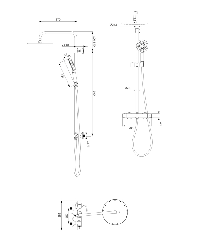 Y termostatický sprchový systém pro instalaci na stěnu
