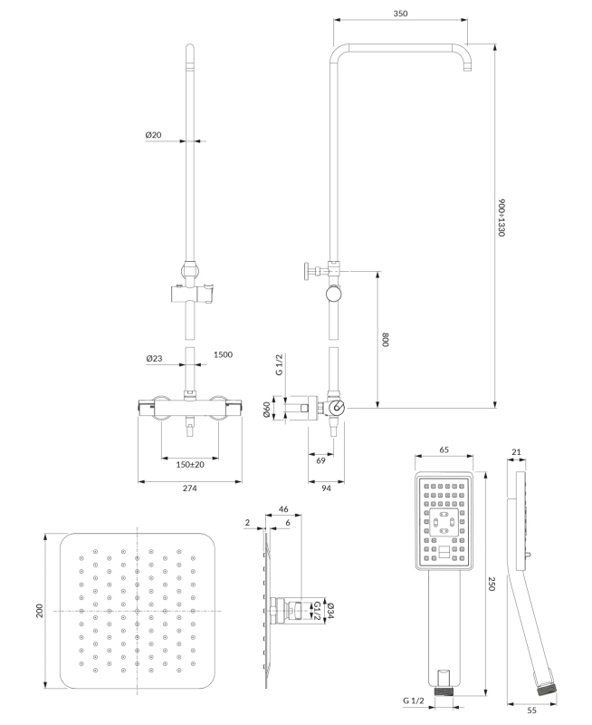 Systém zahrnuje nerezovou sprchovou hlavici s rozměry 20 x 20 cm. Hlavice má dosah od stěny 43 cm a poskytuje příjemný a široký proud vody. Kromě toho je k dispozici ruční sprcha se 3 funkcemi, která vám umožní přizpůsobit sprchový zážitek podle vašich preferencí.