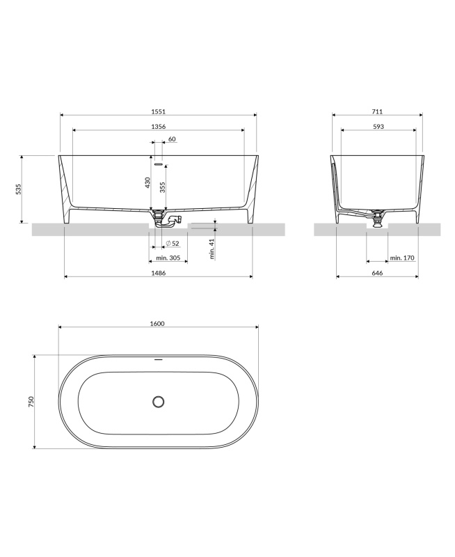 OVO M+ wanna wolnostojąca z przelewem 160 x 75 cm, biały mat