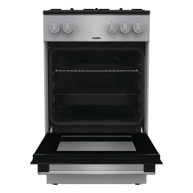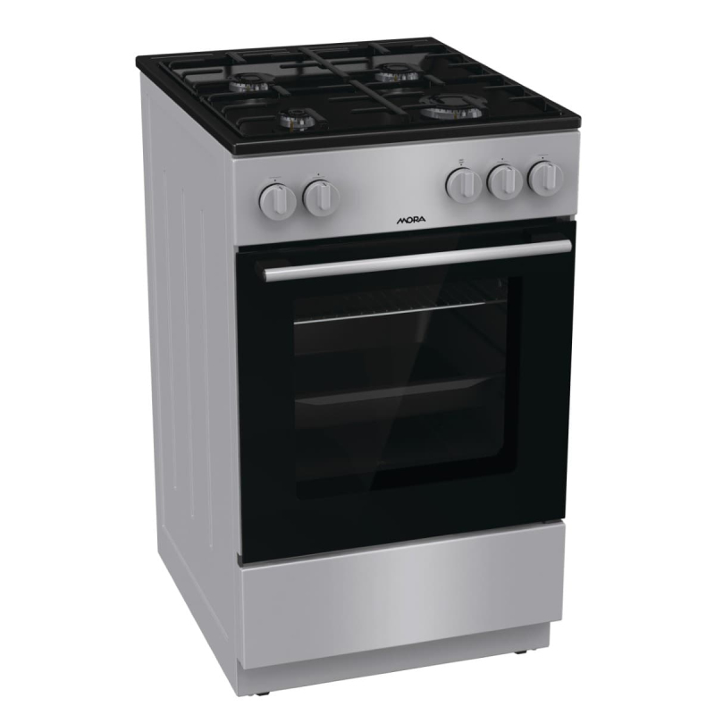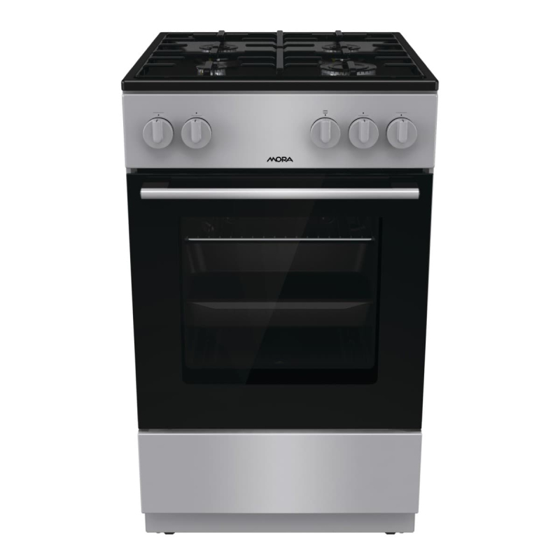 Sporák plynový Mora o šířce 50 cm a výšce 85 cm. Počet plotýnek 4 a energetická třída spotrebiče je A.