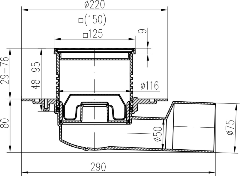 Podlahová vpusť boční černá D50/75 NEPTUN, nerez příruba, mřížka FACE černá F1 388 B X C