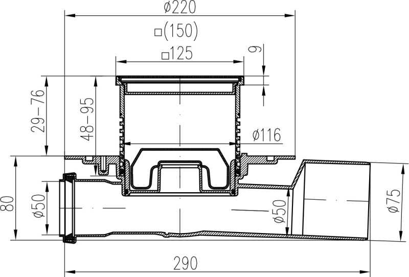 Podlahová vpusť průběžná černá D50/75 NEPTUN, nerez mřížka GATE černá G1 427 A X C