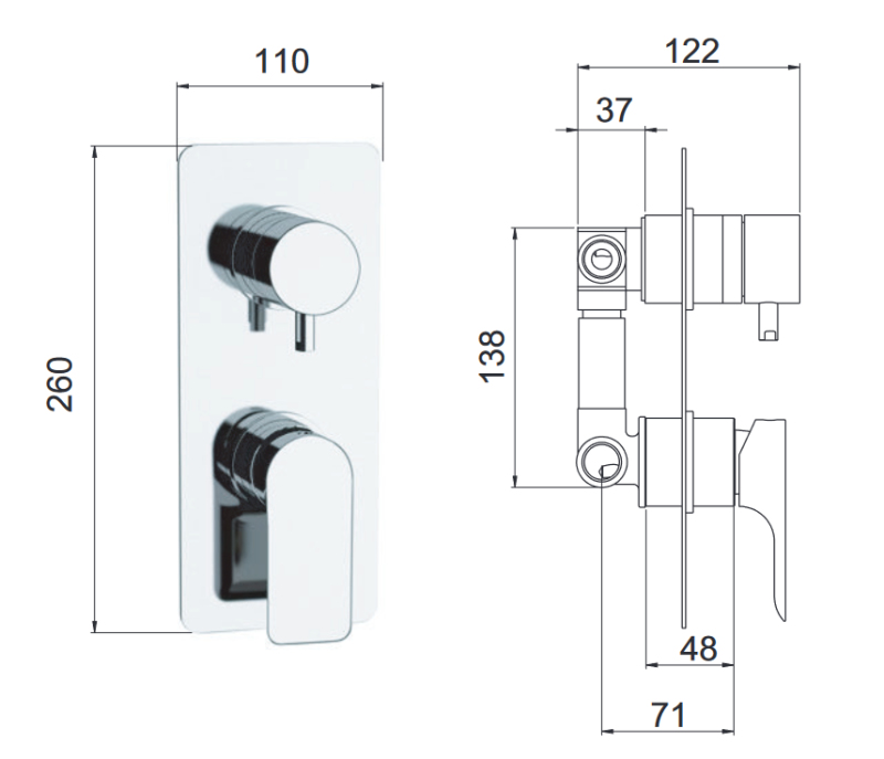 - Sprchová baterie podomítková, bez příslušenství, s přepínačem, 2 výstupy