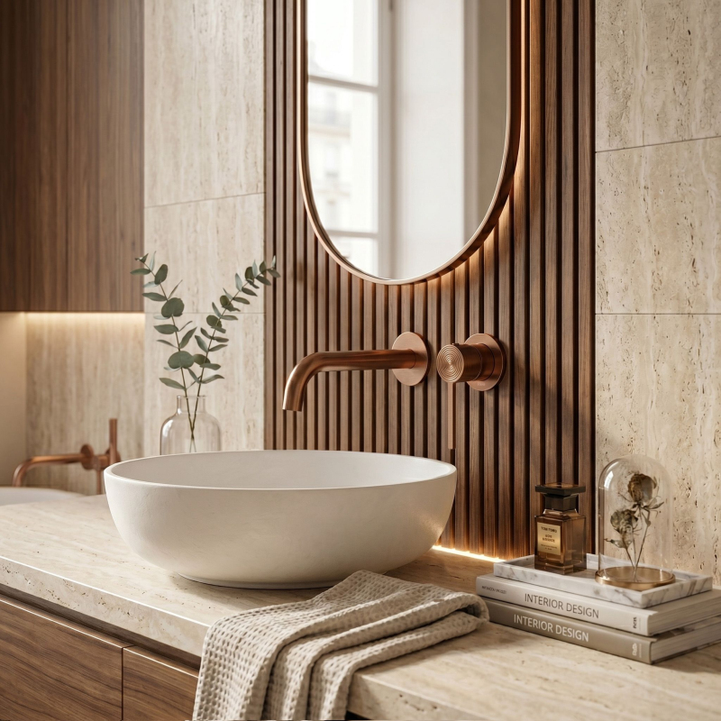 Podomítková umyvadlová baterie Foster v barvě Brushed Copper je moderní řešení, které umožňuje zcela skrýt připojovací prvky ve stěně. Díky tomu získává umyvadlová zóna minimalistický vzhled a další prostor na desce.Montážní systém Box – baterie je vybavena inovativním instalačním boxem, který výrazně zjednodušuje montáž. Box má zabudovanou vodováhu usnadňující přesné nastavení a krycí prvky. Poskytuje také rychlý přístup k vnitřním součástem během údržby.Charakteristický vzor na rukojeti – ovládací prvek byl ozdoben geometrickými, soustřednými drážkami. Tento jedinečný detail odlišuje sérii Foster od standardních modelů a dodává jí moderní styl.Povrchová úprava Brushed Copper (PVD) – technologicky vyspělý PVD povlak zaručuje nejvyšší odolnost proti mechanickému poškození a korozi. Kartáčovaná struktura je praktická pro každodenní použití, protože jsou na ní méně vidět skvrny od vody a otisky prstů.Mosazná konstrukce a keramická kartuše – tělo z odolné mosazi a špičková keramická kartuše zajišťují těsnost a plynulou regulaci proudu vody po mnoho let.Úspora místa – podomítková montáž je ideální volbou pro menší koupelny a projekty, kde záleží na estetické čistotě formy a snadném udržování pořádku kolem umyvadla.Výběrem podomítkové baterie Foster získáte technicky vyspělý produkt se systémem Box, který usnadňuje život a spojuje spolehlivost s originální povrchovou úpravou Brushed Copper.