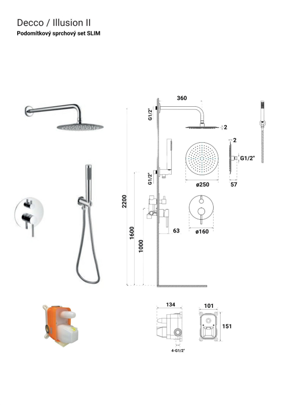 Součástí balení je podomítková baterie SLIM DECCO/ILLUSION II + podomítkový montážní box + ruční sprcha + sprchová hadice + vývod a držák ruční sprchy + hlavová sprcha s držákem.