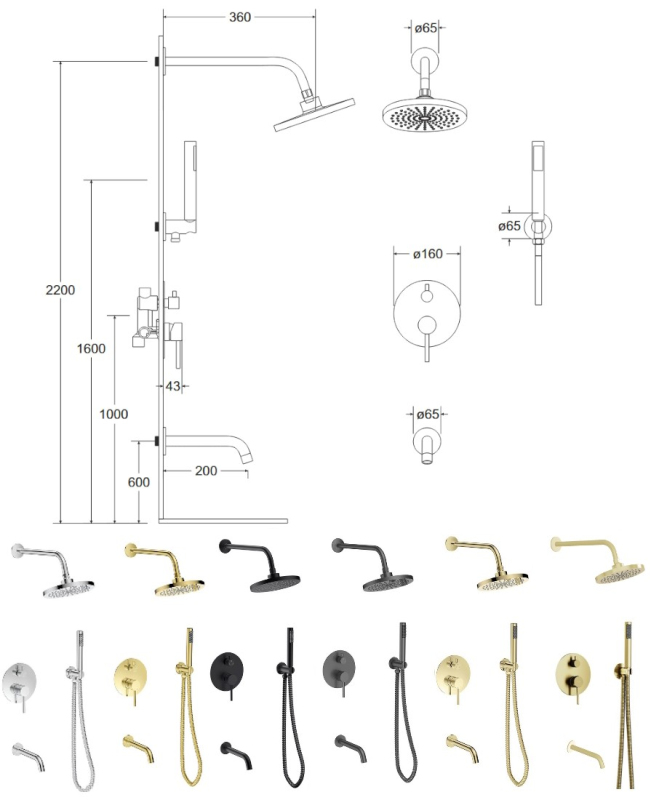 - Set obsahuje podomítkovou baterii, vývod ze stěny s držákem, včetně ruční sprchy a hadice, dále držák a kulatou hlavovou sprchu a stěnový vývod