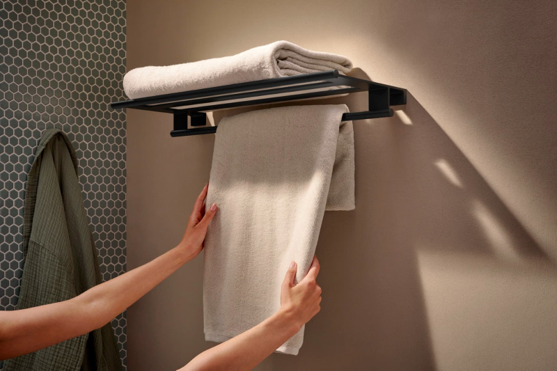 Police na ručníky v barevném provedení matná černá. Šířka tohoto koupelnového doplňku od značky Hansgrohe je 66,1 cm a je vyroben z materiálu kov. Montáž vrtáním.