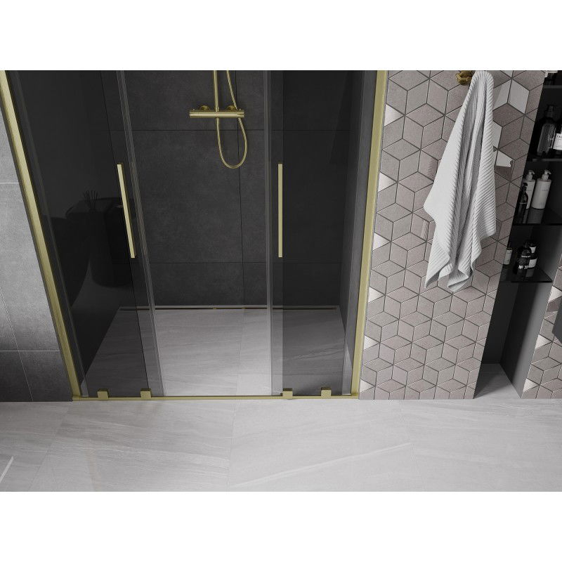 Specifikace produktu: Rozměr: 150x200 cm Montáž: Univerzální Vchod: Posuvný Barva skla: Grafit Typ skla: Tvrzené Tloušťka skla: 8 mm Profil: Hliník Povrchová úprava: Kartáčované zlato Povlak pro snadné čištění Vyrovnání nerovností stěny Nastavení šířky Možnost montáže na sprchovou vaničku nebo obklady Nerezová klika Sada těsnění pro odvod vody Hliníkový práh pro těsnění dveří