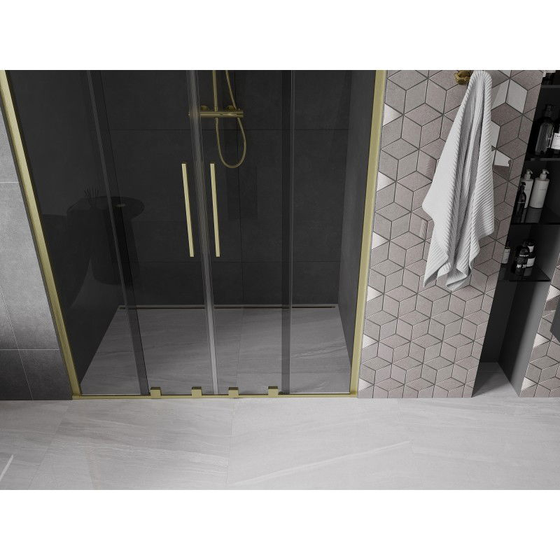 Specifikace produktu: Rozměr: 160x200 cm Montáž: Univerzální Vchod: Posuvný Barva skla: Grafit Typ skla: Tvrzené Tloušťka skla: 8 mm Profil: Hliník Povrchová úprava: Kartáčované zlato Povlak pro snadné čištění Vyrovnání nerovností stěny Nastavení šířky Možnost montáže na sprchovou vaničku nebo obklady Nerezová klika Sada těsnění pro odvod vody Hliníkový práh pro těsnění dveří