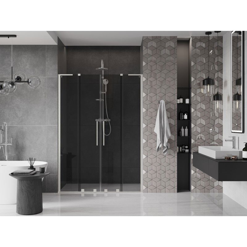 Specifikace produktu: Rozměr: 150x200 cm Montáž: Univerzální Vchod: Posuvný Barva skla: Grafit Typ skla: Tvrzené Tloušťka skla: 8 mm Profil: Hliník Povrchová úprava: Kartáčovaný nikl Stabilizátor úhlu L: Nerezová ocel Povlak pro snadné čištění Vyrovnání nerovností stěny Nastavení šířky Možnost montáže na sprchovou vaničku nebo obklady Nerezová klika Sada těsnění pro odvod vody Hliníkový práh pro těsnění dveří
