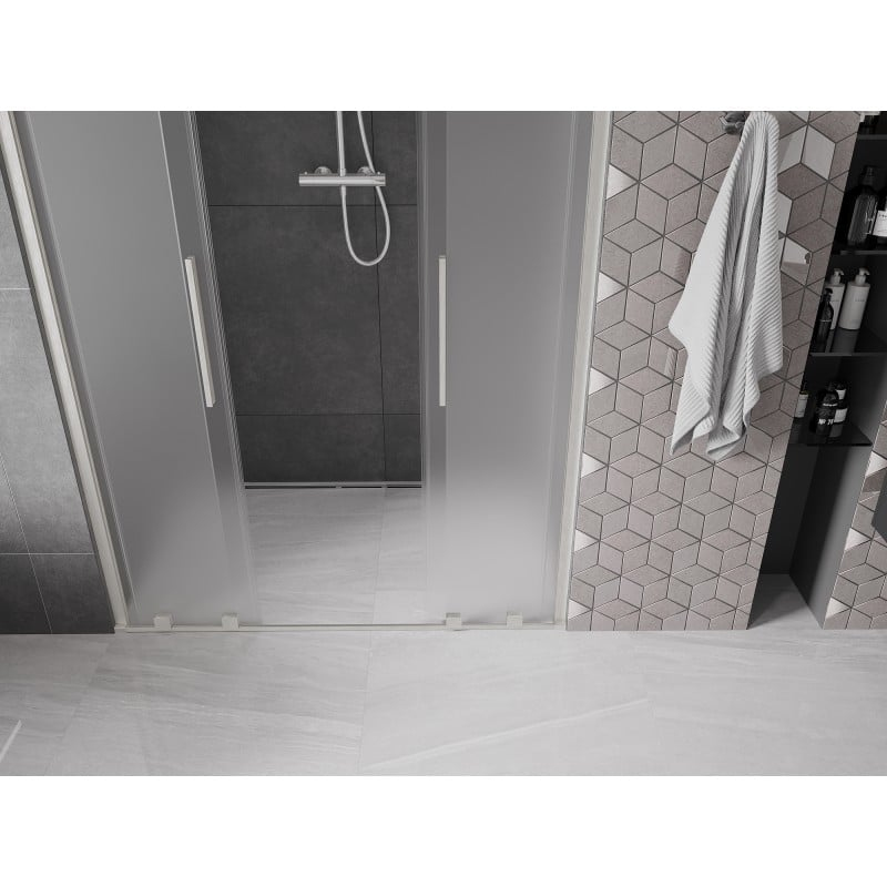 Specifikace produktu: Rozměr: 150x200 cm Montáž: Univerzální Vchod: Posuvný Barva skla: Mléčná Typ skla: Tvrzené Tloušťka skla: 8 mm Profil: Hliník Povrchová úprava: Kartáčovaný nikl Stabilizátor úhlu L: Nerezová ocel Povlak pro snadné čištění Vyrovnání nerovností stěny Nastavení šířky Možnost montáže na sprchovou vaničku nebo obklady Nerezová klika Sada těsnění pro odvod vody Hliníkový práh pro těsnění dveří