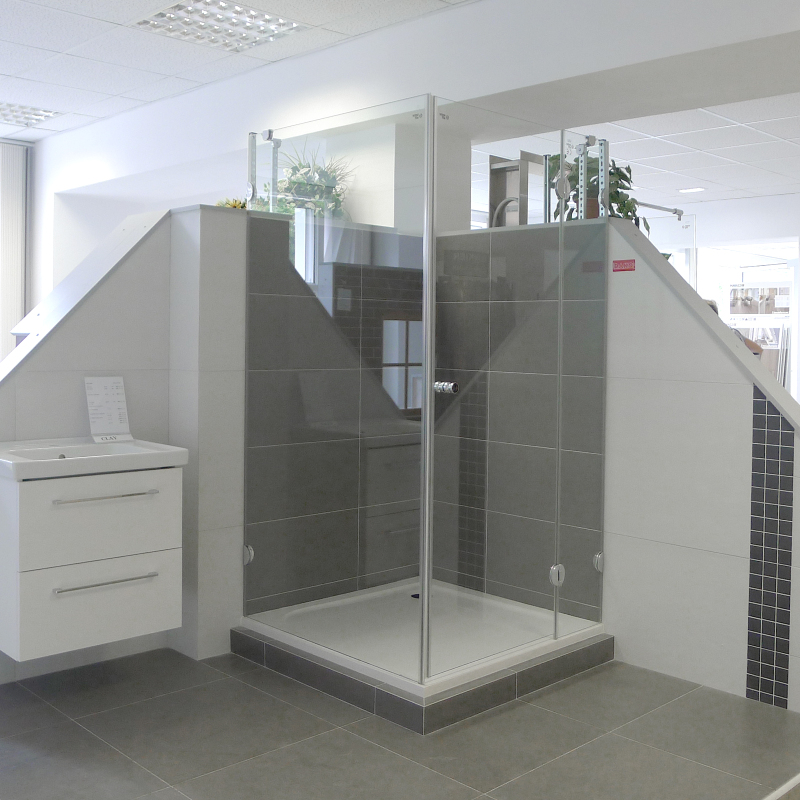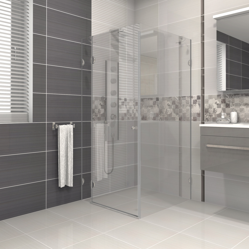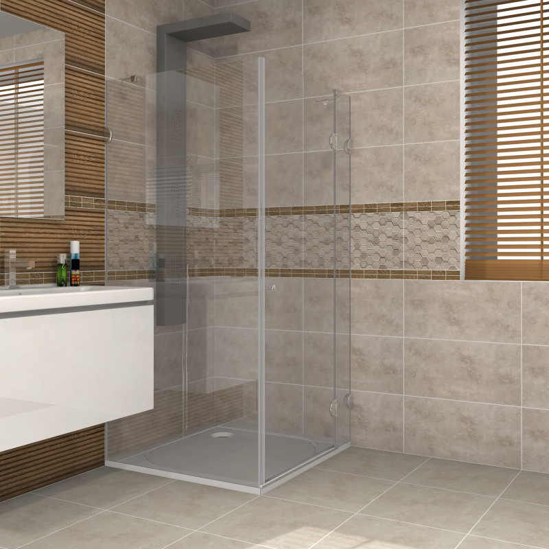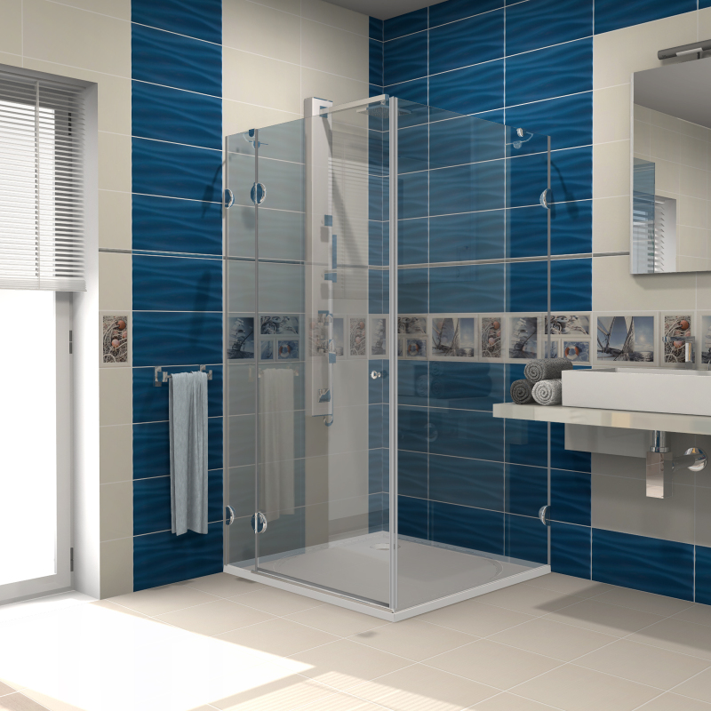 Pevné skleněné výplně tloušťky 8 mm jsou na stěně upevněny pomocí chromovaných závěsů, dveře jsou o tloušťce 6 mm.
