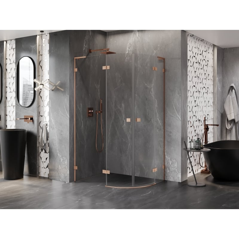 Specifikace produktu: Rozměr: 80x70 cm (levé dveře 80 cm, pravé dveře 70 cm) Výška: 200 cm Poloměr zakřivení R55 Strana montáže: Levá Vchod: Dveře s otočnými panty Barva skla: Průhledná Povrchová úprava: Kartáčovaná měď Profil: Hliník Stabilizátor ve tvaru L: Nerezová ocel Typ skla: Tvrzené Tloušťka skla: 8 mm Povrchová úprava pro snadné čištění Možnost nastavení šířky Dva montážní systémy: - S profilem, který umožňuje vyrovnání nerovností stěn - Bez profilu pro dokonale rovné stěny Možnost montáže na sprchovou vaničku nebo obklady Mechanismus pro zvedání a spouštění dveří Mosazné svorky a panty v jedné rovině se skleněnou tabulí Magnetický proužek a elastomerové těsnění pro odvod vody Hliníkový práh těsnění dveří