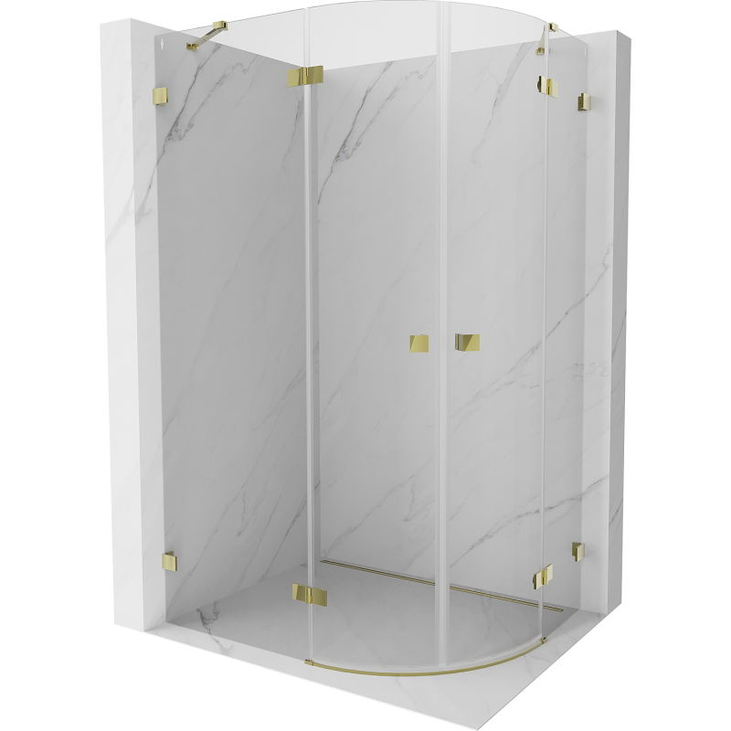 Specifikace produktu: Rozměr: 100x90 cm (levé dveře 100 cm, pravé dveře 90 cm) Výška: 200 cm Poloměr zakřivení R55 Strana montáže: Levá Vchod: Dveře s výklopnými křídly Barva skla: Průhledná Povrchová úprava: Zlatá Profil: Hliník Typ skla: Tvrzené Tloušťka skla: 8 mm Povrchová úprava pro snadné čištění Možnost nastavení šířky Dva montážní systémy: - S profilem, který umožňuje vyrovnání nerovností stěn - Bez profilu pro dokonale rovné stěny Možnost montáže na sprchovou vaničku nebo obklady Mechanismus pro zvedání a spouštění dveří Mosazné svorky a panty v jedné rovině se skleněnou tabulí Magnetický proužek a elastomerové těsnění pro odvod vody Hliníkový práh těsnění dveří