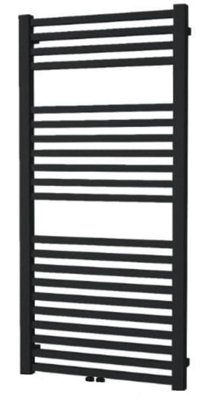 Kombinovaný radiátor ISAN Quadrat v černé matné barvě. Radiátor lze použít standardně pro teplovodní vytápění, ale díky středovému připojení je možné po přikoupení topné tyče vytápět i z elektřiny.