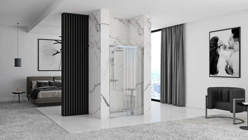 Sprchové dveře Alex představují dokonalou kombinaci estetiky koupelny a pohodlí při koupání. Jsou vyrobeny z nejkvalitnějšího tvrzeného skla a mají moderní povrchovou úpravu EasyClean. Dveře Alex se skládají z jednoho pevného a dvou posuvných prvků. Otevírání dvěří je pravotočivé. Pro změnu směru dveří na levotočivý je třeba vyšroubovat svislé profily v koncovém pohyblivém prvku s vyčnívající lištou v podobě kliky a profily posunout na druhou stranu skla. CAD