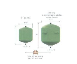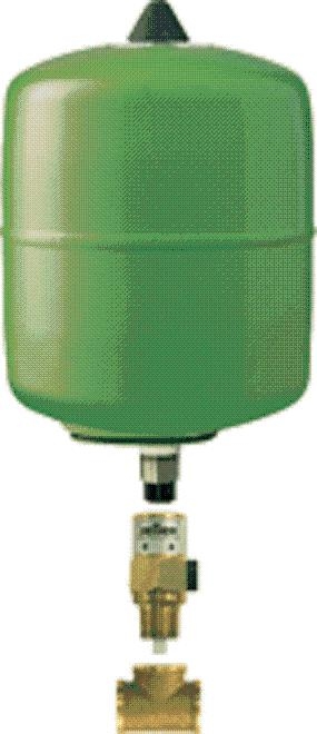 Expanzní nádoba pro rozvody, čerpací stanice a ohřev pitné vody - s plastovou růžicí částečně zajišťující průtočnost - butylový vak podle DIN 4807 T 5, DIN DVGW - standardní zelený nátěr - přetlak plynu z výroby 4 bary - doporučená kombinace s průtočnou armaturou flowjet