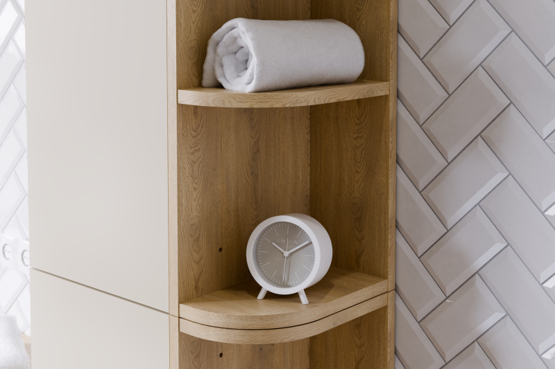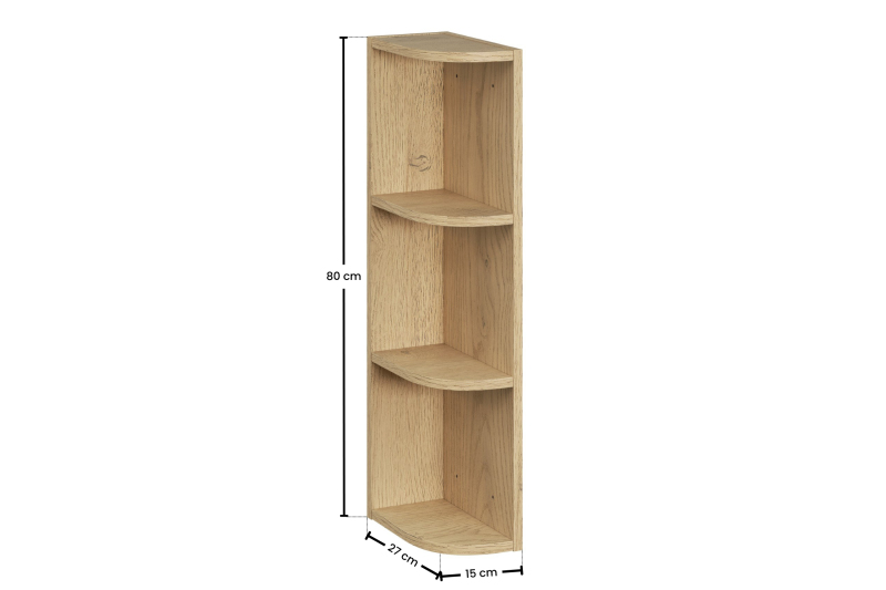 Ten regał górny o szerokości 15 cm to subtelny akcent, który wprowadza naturalne ciepło i ład do minimalistycznych wnętrz. Jego zaokrąglony, narożny kształt płynnie domyka zabudowę, dodając aranżacji miękkości i elegancji. Mebel został starannie wykończony w dekorze Dąb Cremona, wiernie odwzorowującym piękno naturalnego drewna i tworzącym przytulną atmosferę. Konstrukcja z trwałej płyty laminowanej zapewnia solidność oraz długotrwałe użytkowanie. Dzięki pełnej kompatybilności z kolekcją Dalia Cashmere możesz swobodnie kreować przestrzeń, dodając jej wyrazistego charakteru i spójnego stylu.