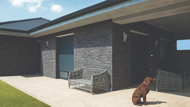 Mrazuvzdorné. Roh Fasádní v barvě black a v imitaci kamene a tloušťce 12-24 mm mm s reliéfním povrchem. Vhodné do interiéru i exteriéru.