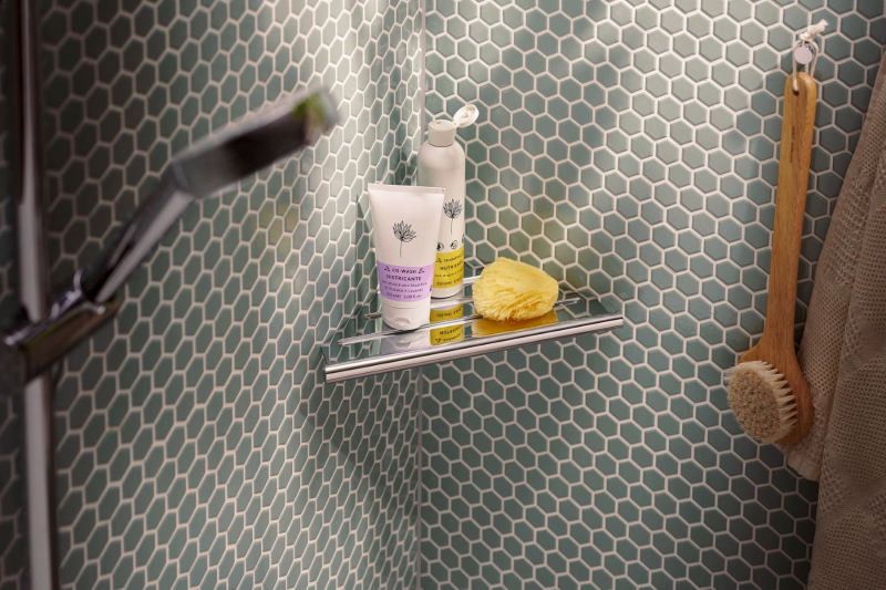 Rohová polička v chromovém provedení. Šířka tohoto koupelnového doplňku od značky Hansgrohe je 30,2 cm a je vyroben z materiálu kov. Montáž vrtáním.