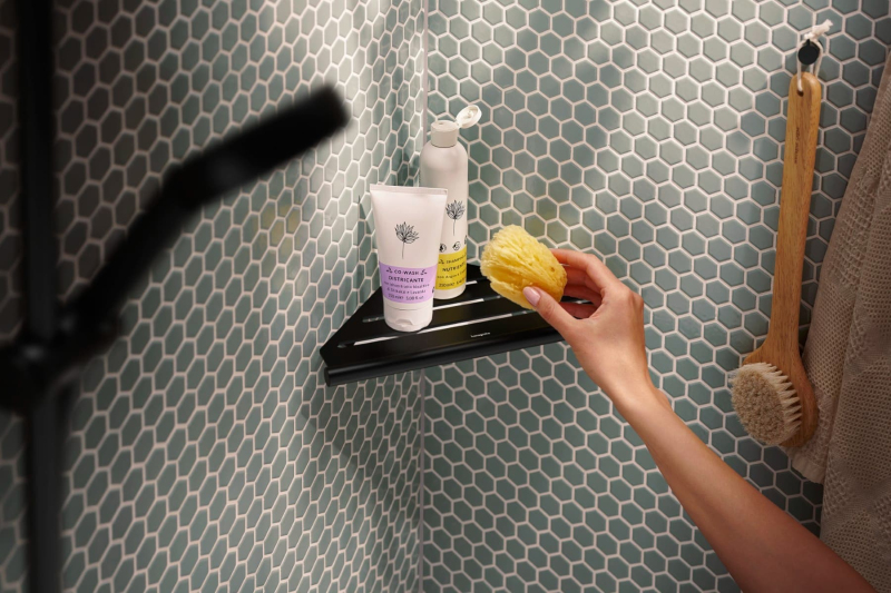 Rohová polička v barevném provedení matná černá. Šířka tohoto koupelnového doplňku od značky Hansgrohe je 30,2 cm a je vyroben z materiálu kov. Montáž vrtáním.