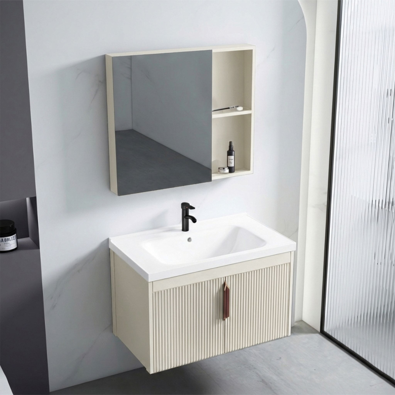 Sestava Astor je moderní závěsný nábytkový systém v béžové barvě. Spojuje minimalistický design s vysokou funkčností a nabízí hotové řešení pro umyvadlovou zónu.Skříňka pod umyvadlo – závěsný modul s elegantními béžovými čely s vertikálním rýhováním. Zajišťuje pohodlné ukládání při zachování moderní estetiky.Keramické umyvadlo – odolná bílá zapuštěná mísa, ideálně přizpůsobená skříňce. Má standardní otvor pro stojánkovou baterii.Skříňka se zrcadlem – funkční prvek s dalšími policemi na kosmetiku, který pomáhá optimálně využít prostor nad umyvadlem.Materiály a konstrukce – vyrobeno z hliníku a plastu, což zajišťuje odolnost proti vlhkosti a snadnou údržbu.Nástěnná montáž – závěsná konstrukce usnadňuje úklid koupelny a dodává interiéru vizuální lehkost.Sestava Astor je ideální volbou pro moderní interiéry. Kombinace teplého béžového odstínu a rýhované struktury čel vytváří stylový a uklizený vzhled koupelny.