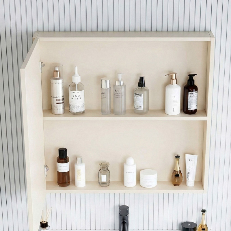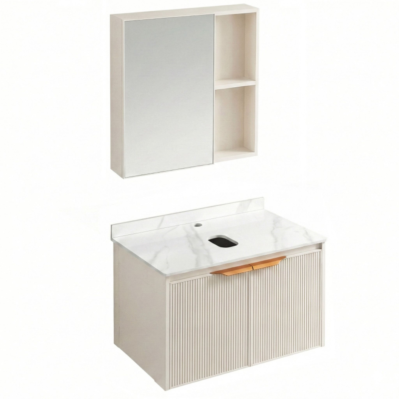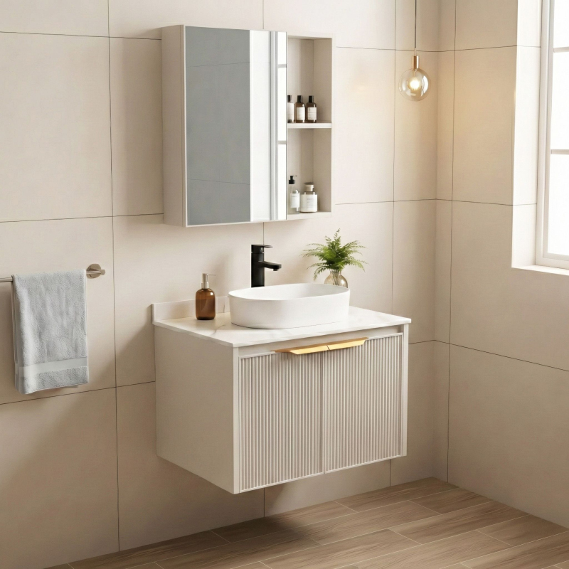 Koupelnová sestava Marti je hotové řešení určené pro montáž umyvadla na desku. Set se skládá ze závěsné spodní skříňky, pracovní desky a horní skříňky se zrcadlem. Celá sestava je postavena na lehké hliníkové konstrukci.Obsah sestavy – balení obsahuje spodní skříňku, desku s otvory a horní skříňku. Umyvadlo a baterie zobrazené na vizualizacích nejsou součástí setu (je nutné je dokoupit zvlášť).Materiál – korpusy a fronty jsou vyrobeny převážně z hliníku. Tento materiál je odolný vůči vlhkosti a vodní páře.Deska s otvory – spodní skříňka je kryta pevnou keramickou deskou. Má dva továrně vyříznuté otvory: jeden pro odpad umyvadla a druhý pro stojánkovou baterii, což usnadňuje instalaci.Rýhované čelo – dvířka pod deskou mají výrazný vlnitý povrch s vertikálními pruhy, který oživuje jednoduchý design.Zrcadlo s policemi – horní skříňka kombinuje zrcadlo s otevřeným regálem. Máš prostor pro ukrytí věcí za dvířky i police na kosmetiku, kterou chceš mít po ruce.Nástěnná montáž – nábytek je určen k zavěšení na stěnu.Sestava Marti je praktická volba, pokud hledáš hotové skříňky pro umyvadlo na desku. Díky keramické desce a hliníkové konstrukci je odolná a snadno se udržuje.
