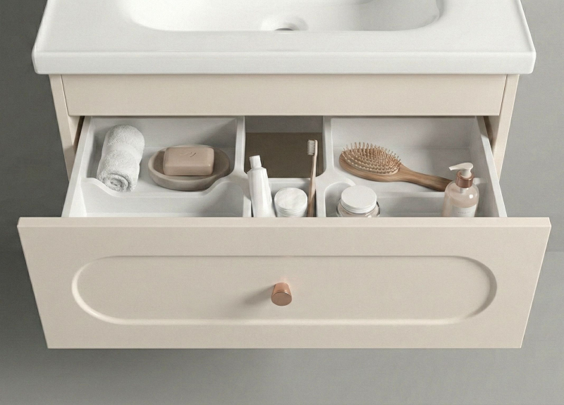 Koupelnová sestava nábytku River je kompletní řešení navržené pro funkční uspořádání umyvadlové zóny. Sestava zahrnuje tři prvky: závěsnou skříňku pod umyvadlo, dedikované keramické umyvadlo a horní skříňku se zrcadlem. Celek tvoří závěsný systém připravený k montáži.Skříňka pod umyvadlo – závěsný modul nabízející praktický úložný prostor. Je vybaven zásuvkou s vnitřním organizérem a otevřenou spodní policí na doplňky. Korpus je vyroben z lehkého plastu.Keramické umyvadlo – zapuštěný model, ideálně přizpůsobený rozměrům skříňky. Má standardní montážní otvor, určený pro instalaci stojánkové baterie.Skříňka se zrcadlem – závěsný prvek, který spojuje funkci zrcadla s dalším místem na kosmetiku díky policím.Konstrukce a materiál – sestava kombinuje klasické keramické umyvadlo s nábytkovými korpusy z plastu, což zajišťuje nízkou hmotnost jednotlivých částí.Nástěnná montáž – všechny prvky sestavy jsou určeny k zavěšení, což usnadňuje přístup k podlaze pod nábytkem.Sestava River je návrh pro osoby hledající hotová a jednoduchá řešení. Kombinace plastových skříněk s keramickým umyvadlem vytváří lehkou konstrukci, která poskytuje potřebnou funkčnost a úložný prostor v koupelně.