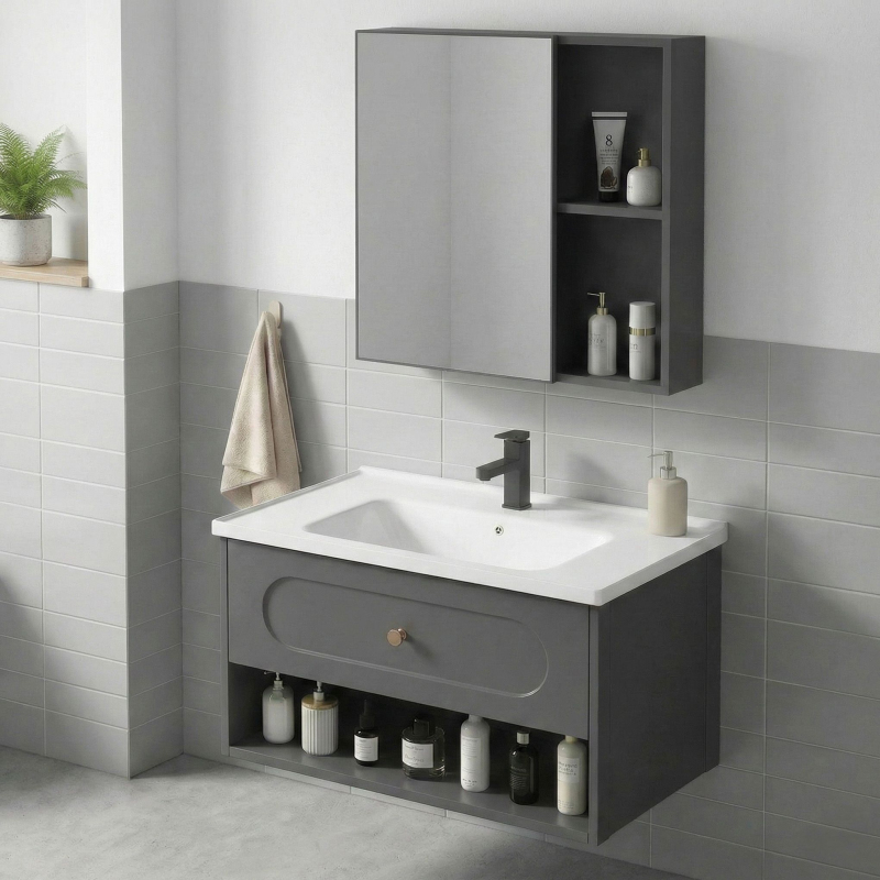 Koupelnová sestava nábytku River je kompletní řešení navržené pro funkční uspořádání umyvadlové zóny. Sestava zahrnuje tři prvky: závěsnou skříňku pod umyvadlo, dedikované keramické umyvadlo a horní skříňku se zrcadlem. Celek tvoří závěsný systém připravený k montáži.Skříňka pod umyvadlo – závěsný modul nabízející praktický úložný prostor. Je vybaven zásuvkou s vnitřním organizérem a otevřenou spodní policí na doplňky. Korpus je vyroben z lehkého plastu.Keramické umyvadlo – zapuštěný model, ideálně přizpůsobený rozměrům skříňky. Má standardní montážní otvor, určený pro instalaci stojánkové baterie.Skříňka se zrcadlem – závěsný prvek, který spojuje funkci zrcadla s dalším místem na kosmetiku díky policím.Konstrukce a materiál – sestava kombinuje klasické keramické umyvadlo s nábytkovými korpusy z plastu, což zajišťuje nízkou hmotnost jednotlivých částí.Nástěnná montáž – všechny prvky sestavy jsou určeny k zavěšení, což usnadňuje přístup k podlaze pod nábytkem.Sestava River je návrh pro osoby hledající hotová a jednoduchá řešení. Kombinace plastových skříněk s keramickým umyvadlem vytváří lehkou konstrukci, která poskytuje potřebnou funkčnost a úložný prostor v koupelně.
