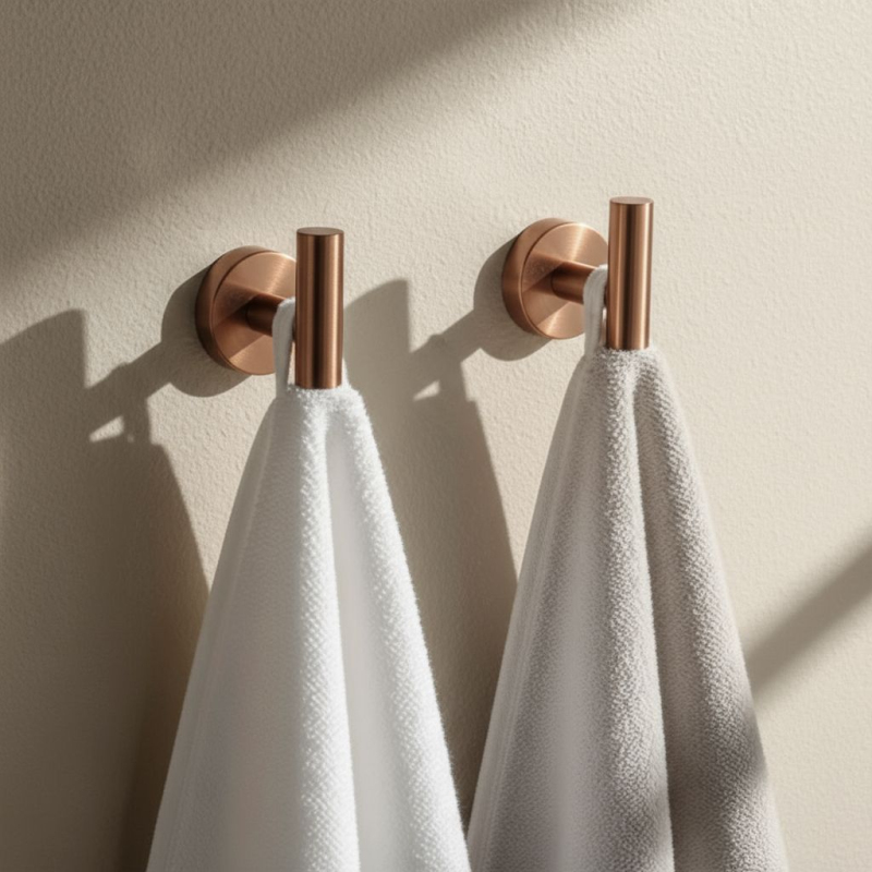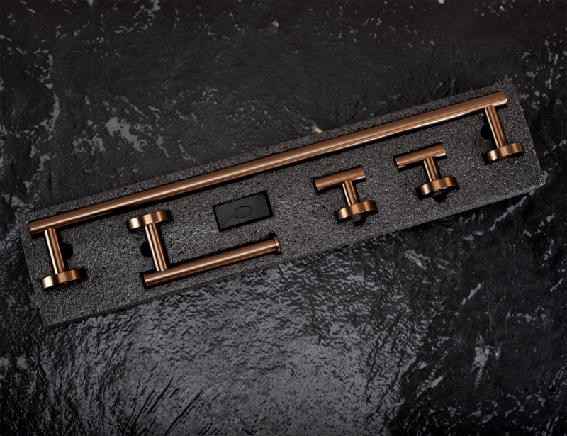 Sada koupelnových doplňků Ari je elegantní a praktické řešení, které vnese do koupelny harmonii a moderní styl. Součástí sady je držák na ručníky, držák na toaletní papír a dva funkční háčky – tvořící jednotný a estetický komplet nezbytný pro každodenní používání. Všechny prvky jsou vyrobeny z vysoce kvalitního kovu, odolného proti vlhkosti a korozi. Povrch v barvě kartáčované mědi dodává celku eleganci a jedinečný charakter, přičemž zůstává odolný proti stopám používání. Doplňky jsou montovány na stěnu, což zaručuje stabilitu, trvanlivost a pohodlí při každodenním používání. Sada Ari spojuje jednoduchost tvaru s nadčasovou estetikou. Její minimalistický design se skvěle hodí jak do klasických, tak moderních koupelen, čímž vytváří jednotný, funkční a elegantní prostor.