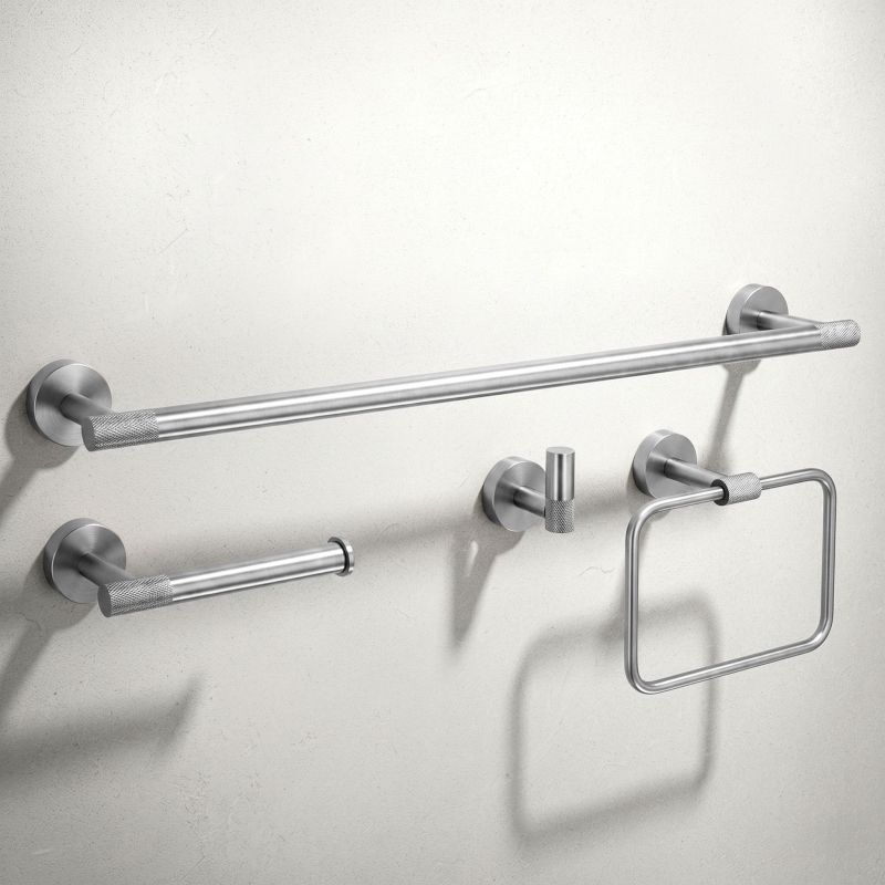 Sada koupelnových doplňků Grid je elegantní a funkční řešení, které se dokonale hodí do každé moderní koupelny. Součástí sady je držák na velký ručník, držák na toaletní papír, háček a kruh na ručník, čímž vytváří jednotný a stylový celek pro každodenní použití. Všechny prvky jsou vyrobeny z odolného kovu, který je rezistentní vůči vlhkosti a korozi, takže si dlouho zachovávají svůj estetický vzhled. Doplňky jsou přišroubované, což zaručuje stabilitu, pevnou instalaci a dlouhou životnost i při častém používání. Koupelnová sada Grid spojuje minimalistický tvar s vysokou kvalitou zpracování. Jednoduchý geometrický design a dekorativní drážkování se skvěle hodí do klasických i moderních interiérů. Je to ideální volba pro ty, kteří oceňují pořádek, funkčnost a nadčasový styl.