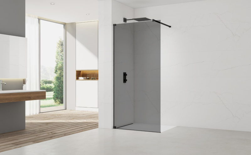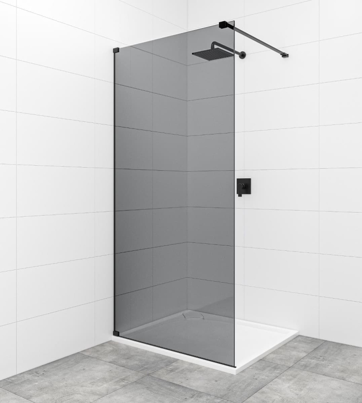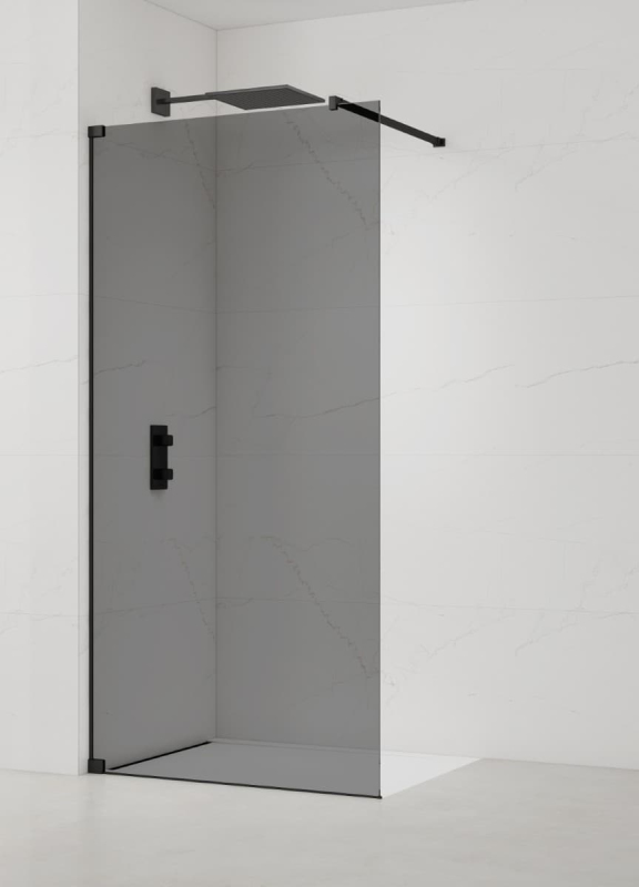 Sprchová zástěna walk-in s panty a zavětrováním v černé barvě, výplň je z neprůhledného skla a má dekor kouřového efektu.