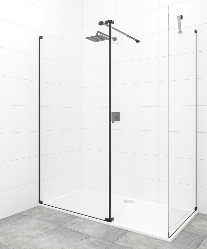 Sprchová zástěna walk-in s panty, zavětrováním a otočnou stěnou v černé barvě, výplň je z čirého skla bez dekoru. Produkt je opatřen povrchovou úpravou Easy Clean, která usnadňuje čistění a minimalizuje usazování vodního kamene. Nelze otevřít - pevný systém. Levá i pravá orientace.