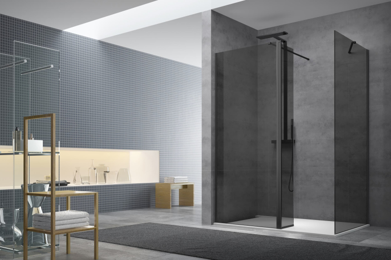 Sprchová zástěna walk-in s profily, zavětrováním a otočnou stěnou v černé barvě, výplň je z neprůhledného skla a má dekor kouřového efektu. Produkt je opatřen povrchovou úpravou Easy Clean, která usnadňuje čistění a minimalizuje usazování vodního kamene. Nelze otevřít - pevný systém. Levá i pravá orientace.