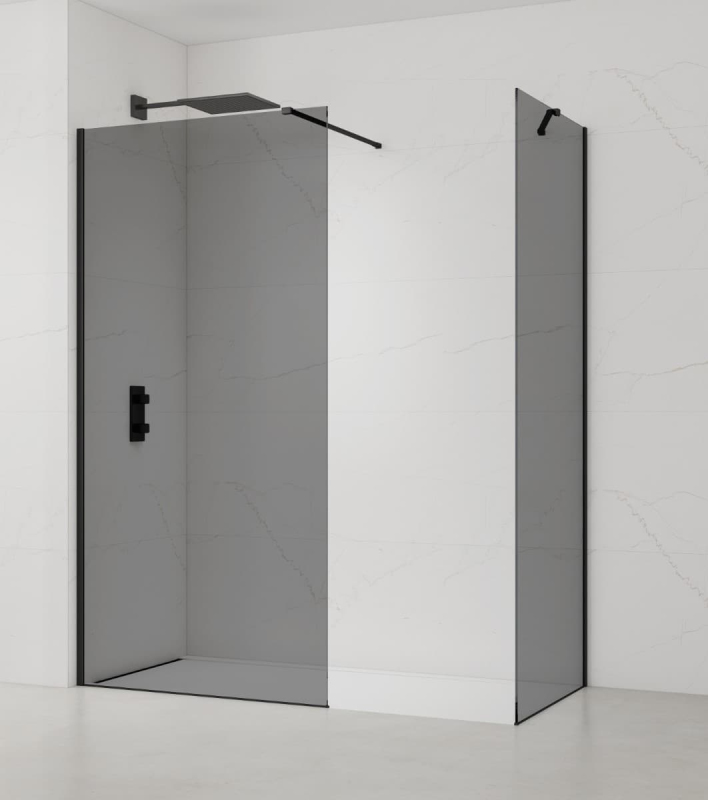 Sprchová zástěna walk-in s profily a zavětrováním v černé barvě, výplň je z neprůhledného skla a má dekor kouřového efektu. Produkt je opatřen povrchovou úpravou Easy Clean, která usnadňuje čistění a minimalizuje usazování vodního kamene. Nelze otevřít - pevný systém. Levá i pravá orientace.