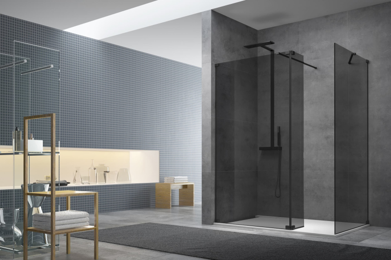 Sprchová zástěna walk-in s panty, zavětrováním a otočnou stěnou v černé barvě, výplň je z neprůhledného skla a má dekor kouřového efektu. Produkt je opatřen povrchovou úpravou Easy Clean, která usnadňuje čistění a minimalizuje usazování vodního kamene. Nelze otevřít - pevný systém. Levá i pravá orientace.