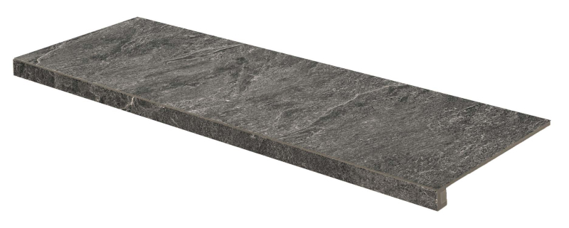 Rektifikované. Mrazuvzdorné. Schodová Tvarovka v barevném provedení night o rozměru 29,8x119,8 cm a tloušťce 9 mm s reliéfním povrchem. Vhodné do interiéru i exteriéru. S velkými a nahodilými odchylkami v odstínu barev, struktury povrchu a kresby.