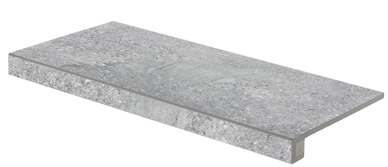 Mrazuvzdorná a rektifikovaná schodová tvarovka v šedé barvě v imitaci kamene o rozměru 29,8x59,8 cm a tloušťce 10 mm s matným povrchem. Vhodné do interiéru i exteriéru. S velkými rozdíly v odstínu barev, struktury povrchu a kresby. Vysoce odolné proti opotřebení. Vhodné do hal hotelů, obchodů a garáže.