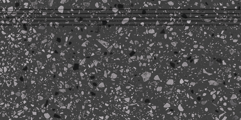 Rektifikované. Mrazuvzdorné. Schodovka v černé barvě a v terrazzo designu o rozměru 29,8x59,8 cm a tloušťce 9 mm s povrchem v provedení lesk/mat. Vhodné do interiéru i exteriéru. S velkými rozdíly v odstínu barev, struktury povrchu a kresby. Vhodné do kuchyně, kanceláří, na balkóny.