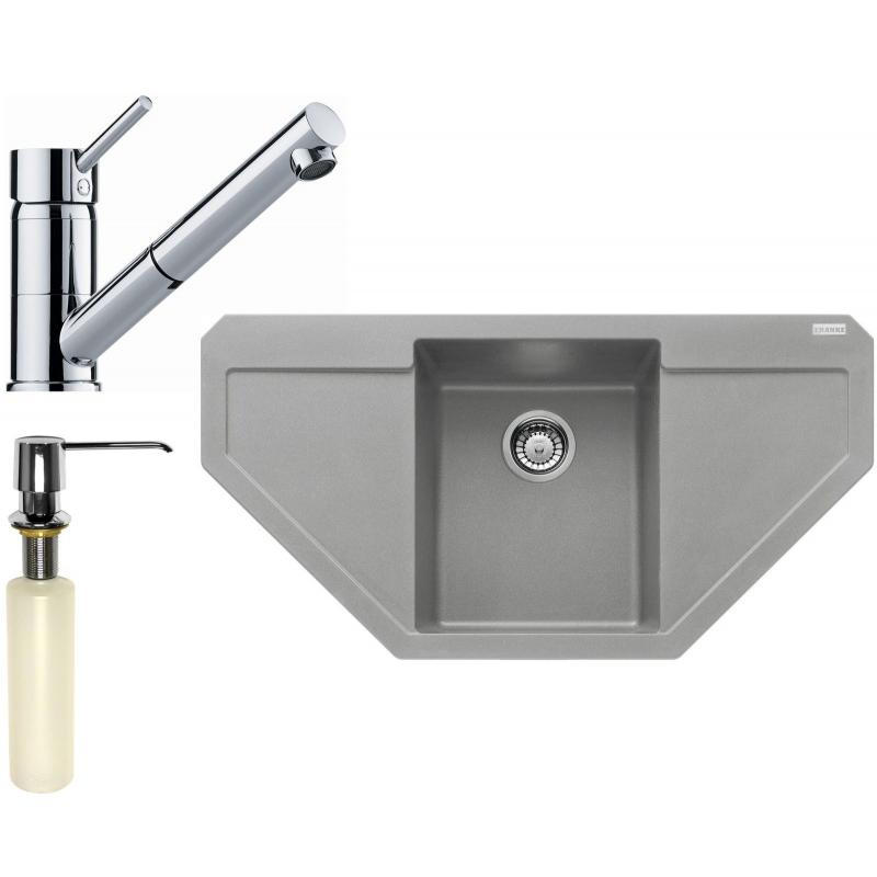Cenově zvýhodněný set Franke G126 obsahuje granitový rohový dřez MRG 612 E o rozměrech 960 x 500 mm v provedení Šedý kámen a baterii s vytahovací koncovkou FG 7486. Set dále obsahuje kvalitní dávkovač saponátu FD 300.