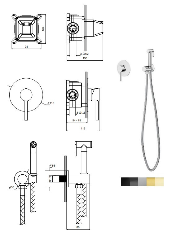 - Set obsahuje vývod ze stěny s držákem, ruční sprchu a hadici