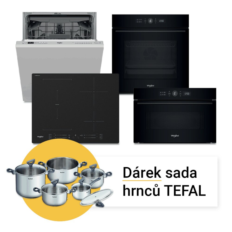 Set obsahuje: Vestavná trouba WOI5S8PM1SBA, Whirlpool Vestavná multifunkční mikrovlnná trouba WMD54MB, Indukční sklokeramická varná deska WLS7965NEBM, Vestavná myčka WIC3C33PFE.