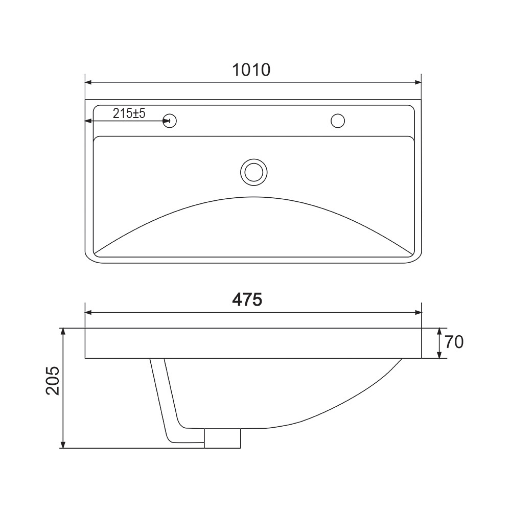 Volba mezi keramickým nebo litým umyvadlem se dvěma otvory pro baterii a jednou výpustí.